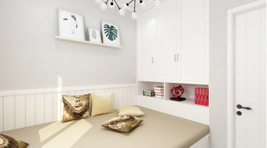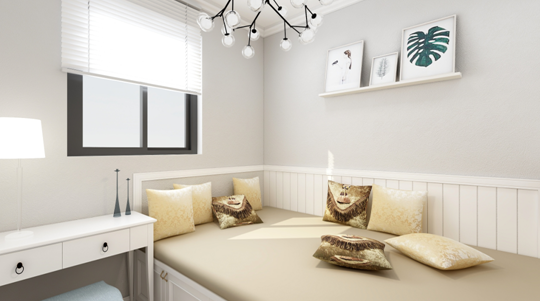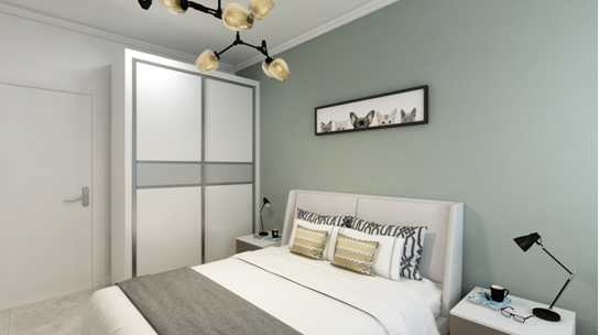 睡床是沿着窗户摆设,两边预留阿足够的走动空间,床头背景粉刷灰绿色墙漆,突出床头背景,与地面地砖颜色相近,看起来甚是和谐。床品采用浅灰色软包形式,增加卧室的舒适感,配上深灰色的床品床头两边金属材质的台灯凸显了整个空间的大气感,床旁边有一个大大衣柜增加了整个屋子的储物空间,卧室顶面采用石膏线,从视觉不会显着压顶.现代住所的开展,小家庭的组成,大家心理上的需求,期望卧室具有私密性、蔽光 性,配套洗浴,静谧舒服,与住所内其他房间分隔开来。我规划的卧室除了主卧加了个内卫外,再者除了摆放双人床外,留有必定的面积摆放卧室家私,如衣柜,电视柜,床头柜,还留有必定空间能够休闲活动