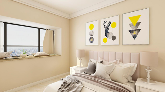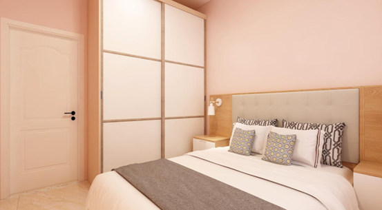 主卧室以温馨舒适为主,素雅大方浅色墙面配以浅色软包床头家具足以体现主人的品位,在设计上床头两侧的床头柜放了台灯,方便主任夜间读书,为房间注入了温馨自然的格调,随时都能保持一份心灵的宁静,回归内心深处。