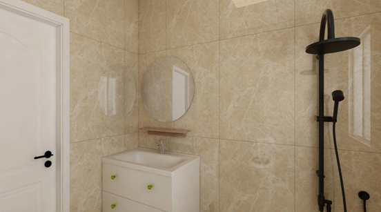 卫生间在选择瓷砖的时候选用了暖白色瓷砖,因为业主不希望空间太冷,马桶朝向应客户要求调整了方向,贴心的考虑到了业主的生活起居。白色的木质浴室柜,透露出自然与原始之美,能充分体现主人的家居档次和身份的尊贵。