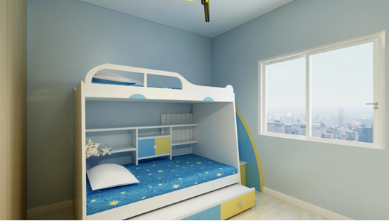 儿童房 的设计以色彩丰富表现这个空间,因为是男孩子居住 所以壁纸运用蓝灰色调,柜子上运用下汽车的卡通造型更加符合男孩子的喜好,并设计了书柜和隔板层,方便以后孩子放置书籍画册和玩具的收纳