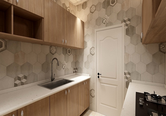 整体橱柜实用为主,地面、墙面与顶面都以浅色调为主,搭配上浅色橱柜门板深色台面,显得稳重大气。由于空间比较局促,水盆和灶具都选择小巧型的,增强空间利用率,并向上方也做了橱柜,并搭配小型储物柜,可以储藏生活用品。