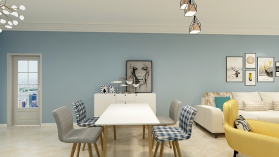 餐厅没有从地面来区分,用顶面造型顶把客厅和走廊做了整体分割,装上有几何造型的装饰吊灯,未安装灯带和筒灯,以实用性为主。墙上的的装饰画,能体现居着的简单心境,长期受到字画的熏陶,也能提升主人自身的文化档次。