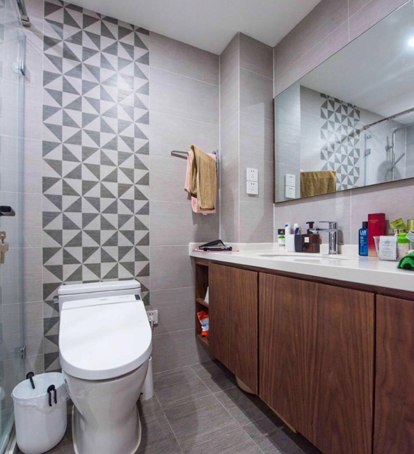 卫生间的深浅搭配看起来很舒服,深色木质浴室柜看起来更有质感,浅色墙砖搭配深色腰线使整体空间更具层次感,坐便后面的背景设计使得整体空间看上去不再单调。整个卫生间以业主的生活习惯为出发点,简洁大气并具有功能性。