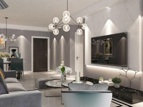 沙发背景墙没有过多的处理而是选用的金属原色的镜面装饰做搭配,整体提升了墙面的空旷感,也增加了空间的明亮性,给人一种时代气息,客厅灯具采用了时尚性很强的魔豆灯,多个透明的灯罩以及黑色的灯杆,满足了空间的照明也给现代风格的演绎画上圆满的句号。