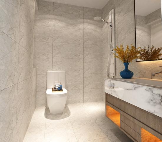 纯白色的洗手台和墙面的浅灰色小砖形成对比,台面上放置了一个小花瓶,作为装饰