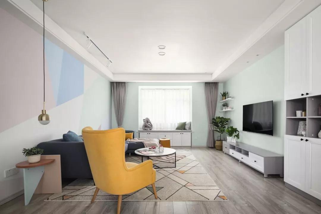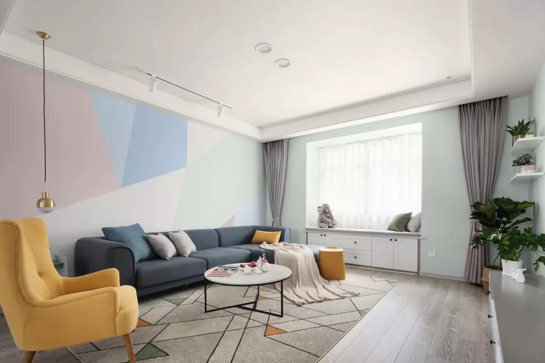 沙发背景墙以几何拼色取代装饰,显得简洁又富有活力。