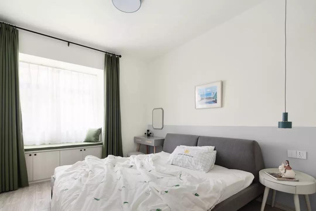 卧室以白色为基调,灰色布艺床两边分别是床头柜和梳妆台,加以抹茶绿的飘窗,颜值与实用性兼备。