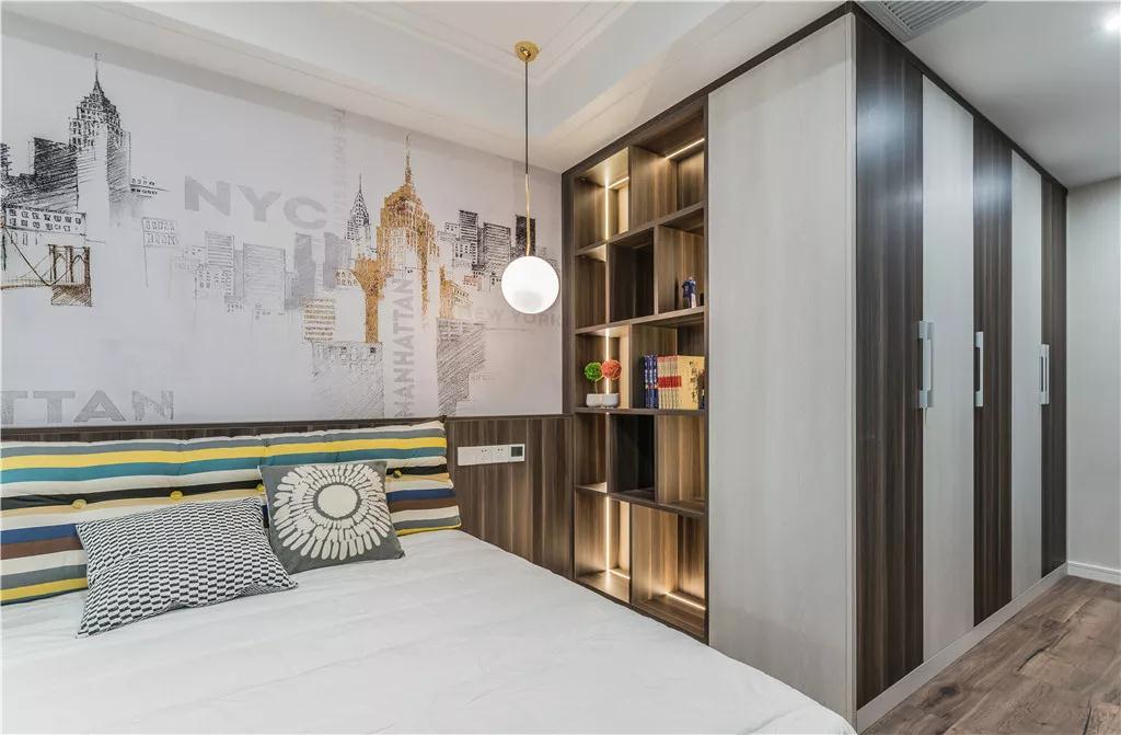 床头墙张贴城市风景的壁纸,配合木质护墙板,营造了格外轻快舒适的视觉。