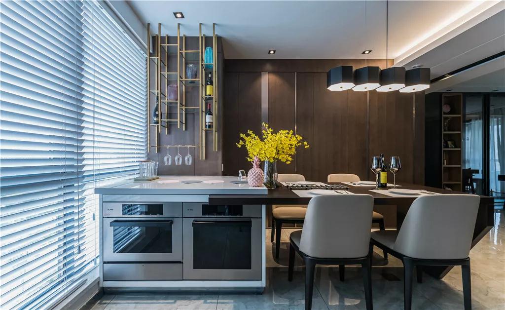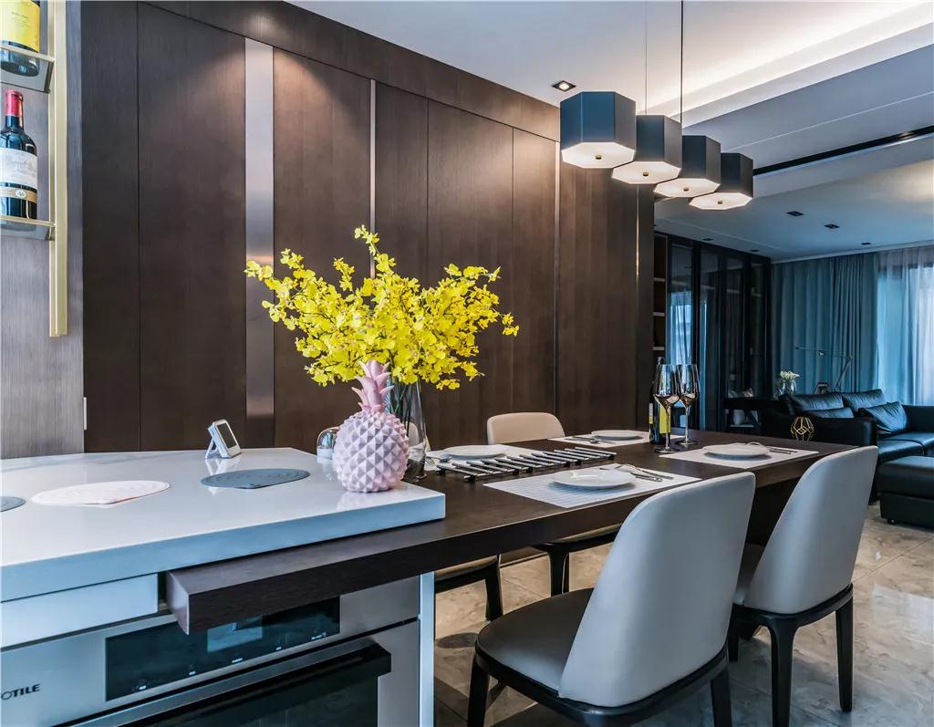 餐厅以深木色饰面板为大背景,吧台式餐桌搭配灰色靠背的餐桌椅,配合六边形的柱状吊灯,烘托写意舒适的小资情调。
