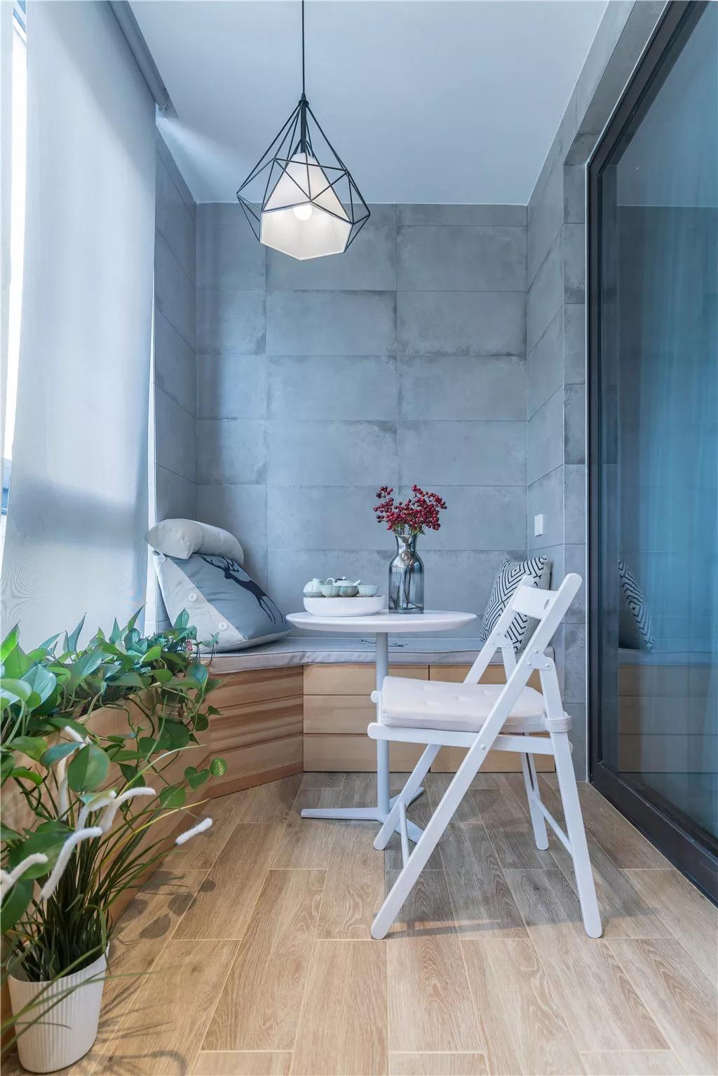 阳台靠窗装上透光的拉帘来缓和刺眼的阳光,卡座加休闲桌椅和绿植,打造了个十分写意自在的休闲空间。