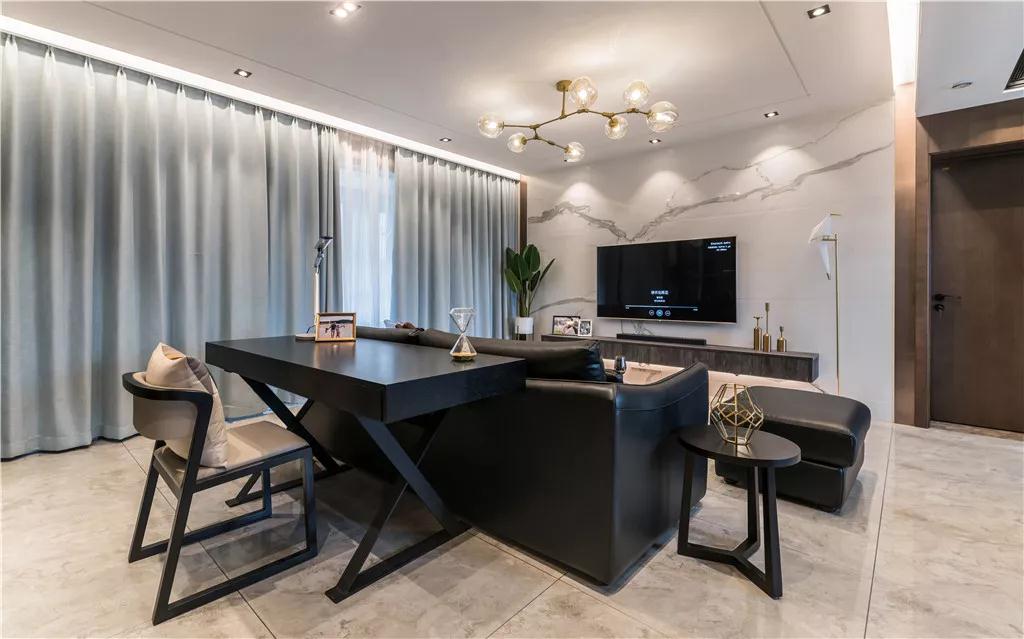 客厅与书房共享筒灯+树枝吊灯的照明,沙发背靠书桌,与大理石质感的电视墙相对,也显得落落大方。