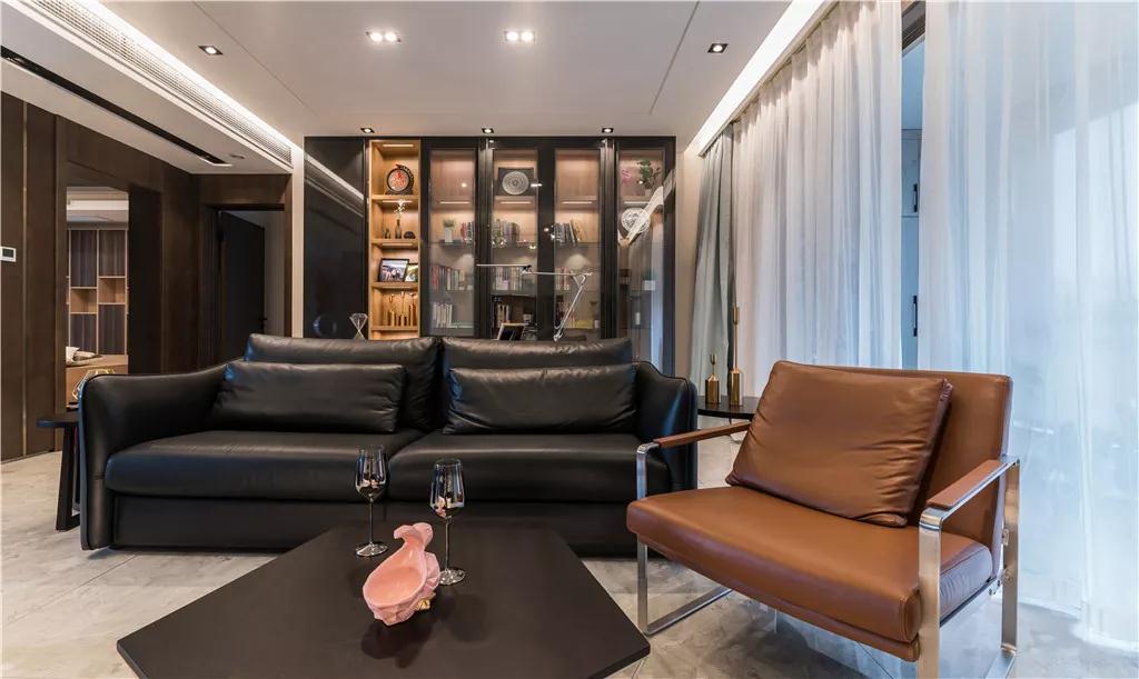 皮艺沙发以书房的玻璃书柜作背景,让琳琅满目的摆件展示带来高档大方的韵味。