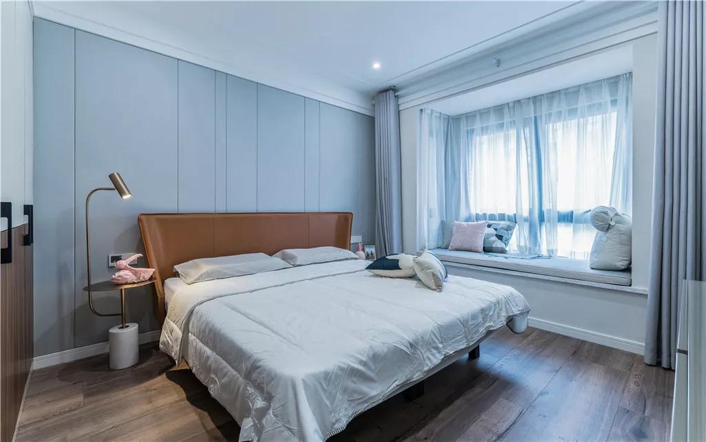 主卧床头背景墙的淡蓝色饰面板和窗帘,奠定了优雅的蓝色主调。