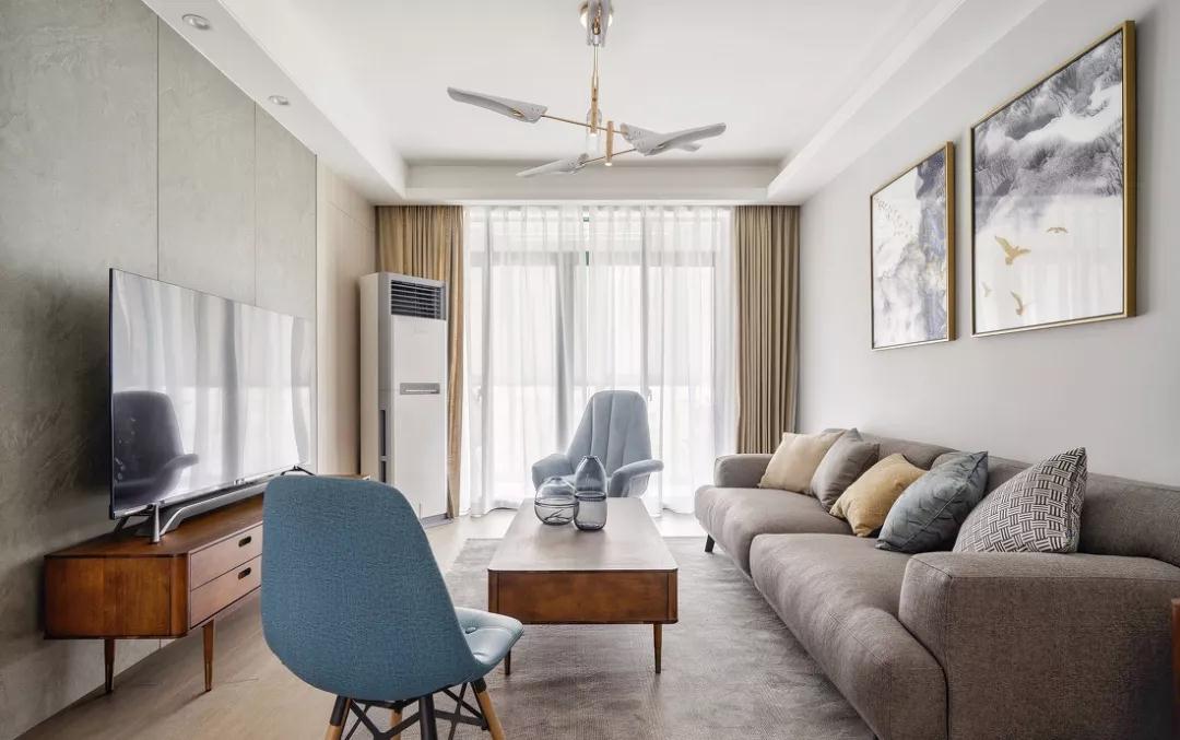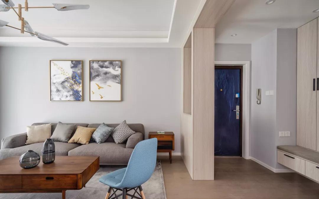 利用一深一浅的蓝色,这组相色系作为整体的配角色,打破灰色沙发带来的沉闷感。