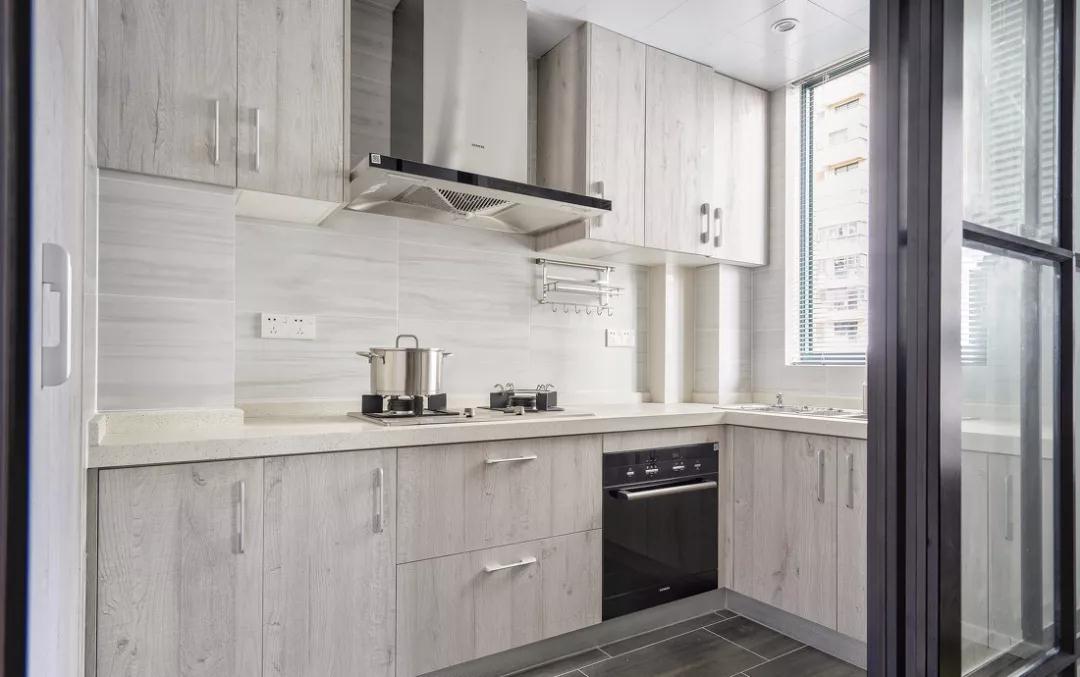 黑白灰+木色的经典组合,运用于不同的材质上,板材、瓷砖、不锈钢、石英石,形成了简洁的厨房空间。