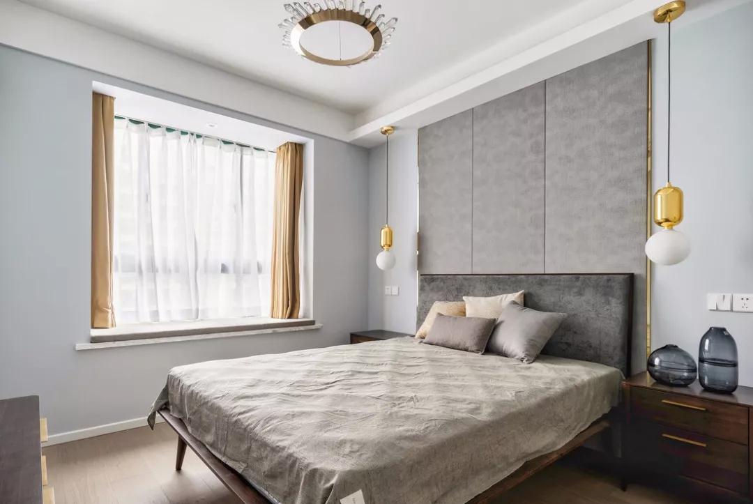 次卧,浅灰色硬包,在金色不锈钢条之间更显质感。