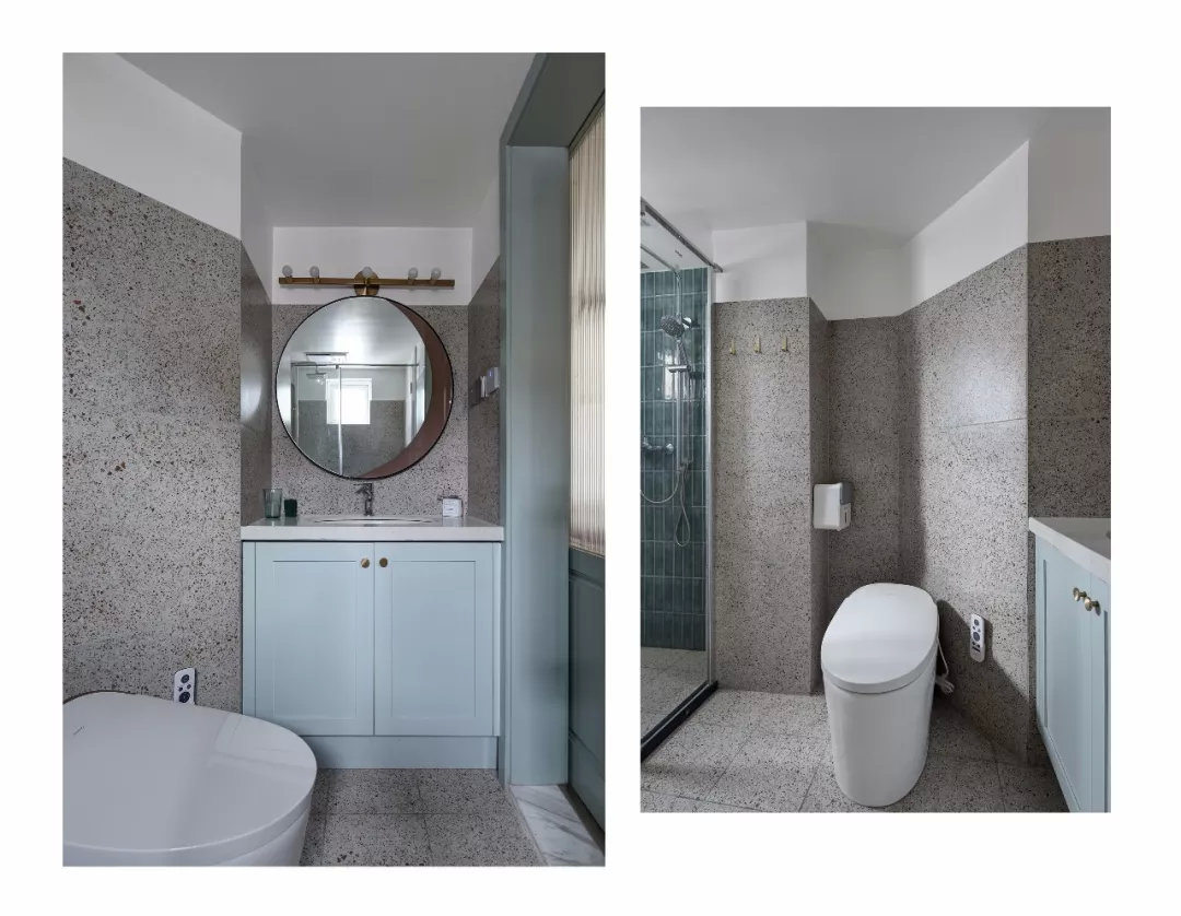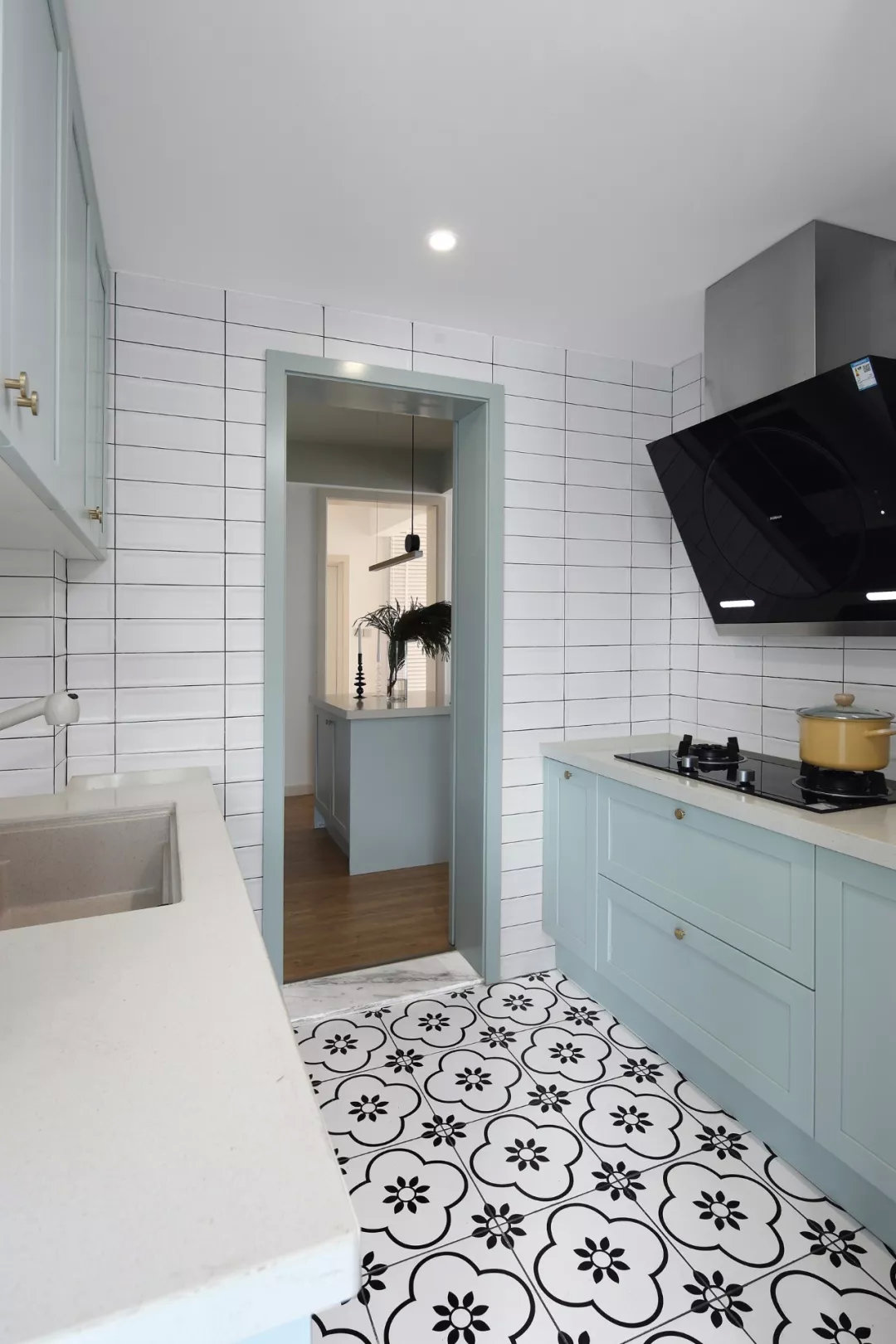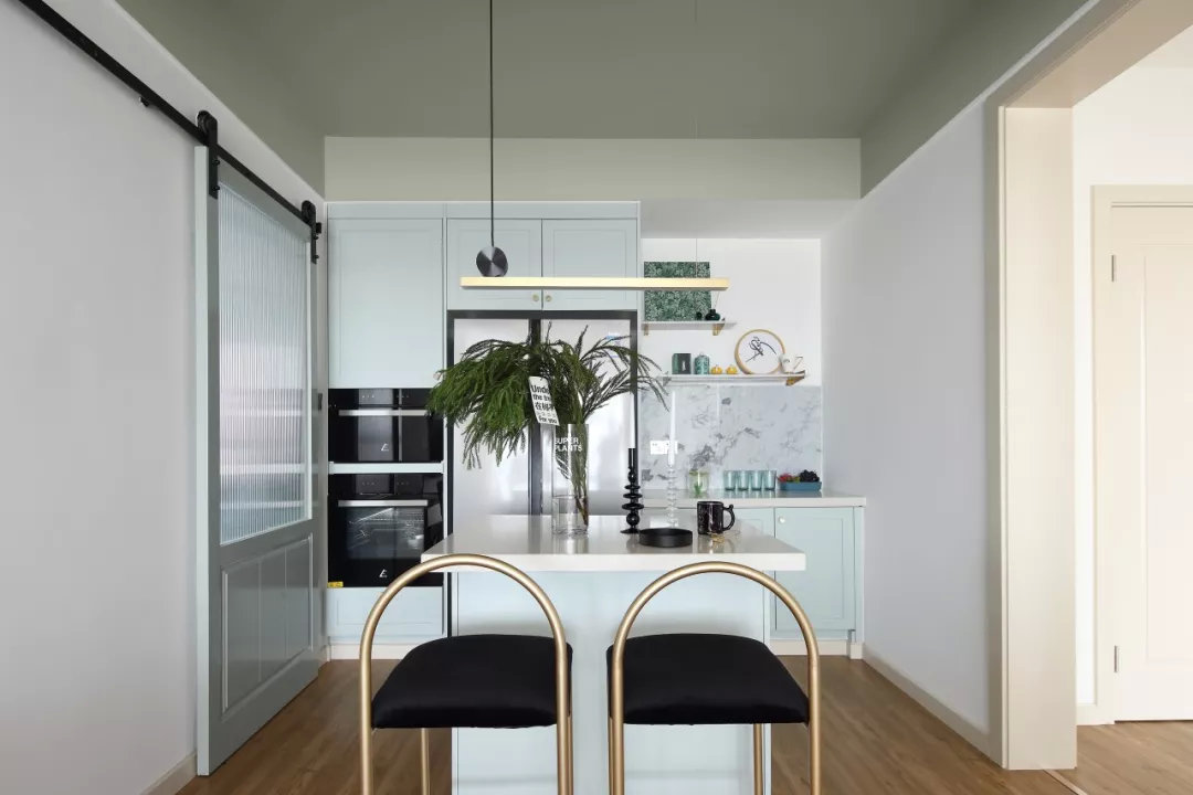 在餐厅的边上还有一个独立的厨房空间,厨房还承担了走廊过道的责任,所以橱柜做了双一字形的布局方案,上方减少吊柜的设计,避免厨房显得太过拥挤。