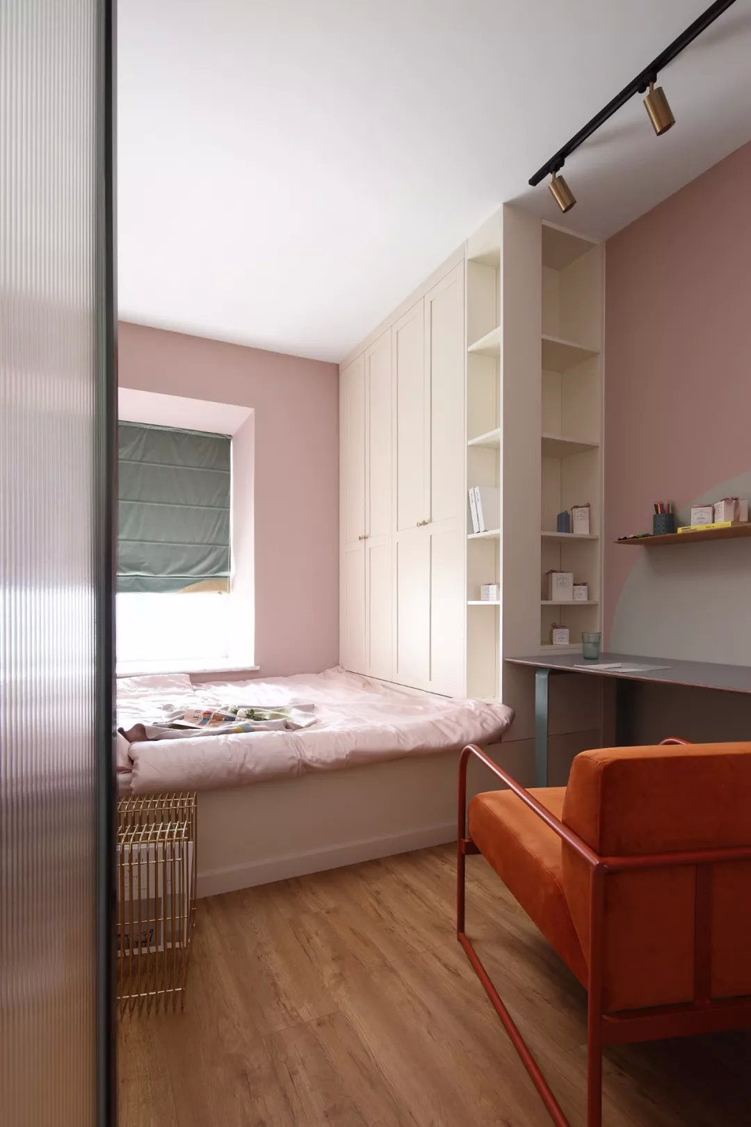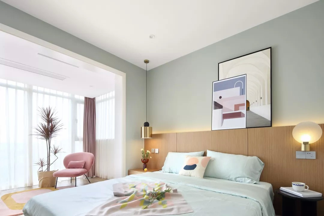 主卧室外的阳台被包进来改成了一个休闲区,粉色的窗帘和椅子结合,让这个空间变得更加可爱和浪漫。